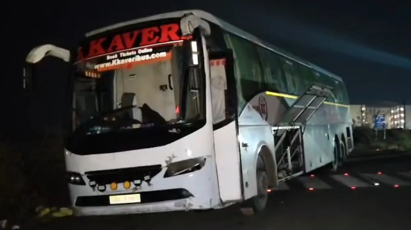 Kurnool: A Kaveri Travels private bus met with a road accident on Tuesday early morning near Tidco House on the outskirts of Kurnool, Andhra Pradesh. The bus, traveling from Pondicherry to Hyderabad, lost control and collided with a road divider after reportedly overspeeding. Fortunately, no oncoming vehicle was present at the time, preventing a more serious accident.