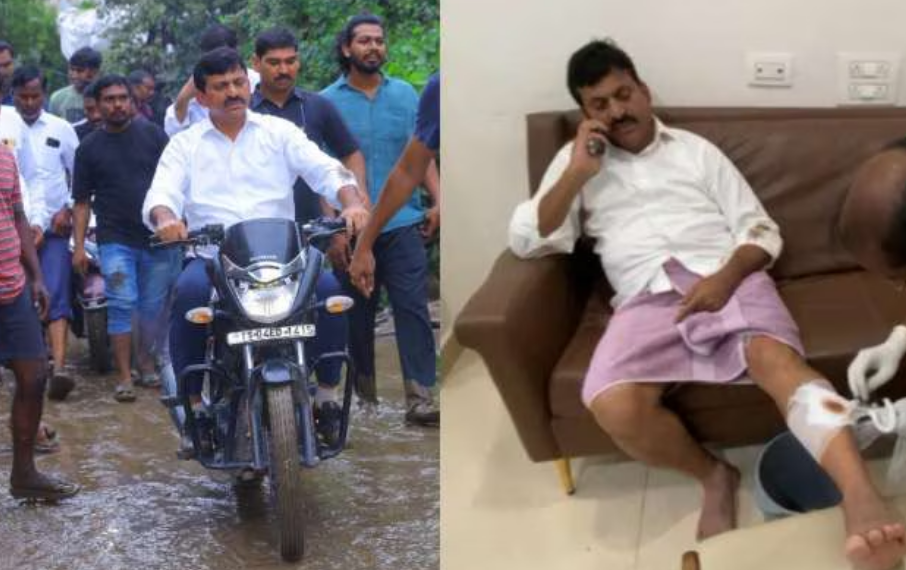 During his visit to the affected areas, Minister Ponguleti Srinivasa Reddy sustained injuries. The Minister was en route on a two-wheeler to engage in relief work when he fell from the vehicle and injured his leg. Immediate first aid was administered by his attendants.