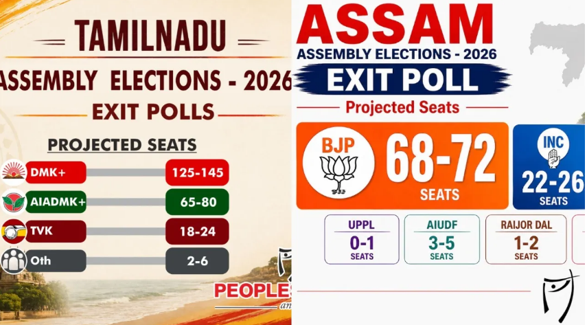 Exit poll projections for the assembly elections in Tamil Nadu, West Bengal, Assam, Kerala, and Puducherry have been released by multiple agencies, indicating divergent political trends across states. Surveys including People’s Pulse, Axis My India, Matrize, Political Laboratory, Chanakya Strategies, and JVC have presented varying estimates, with some states showing clear leads while others indicate tight contests.