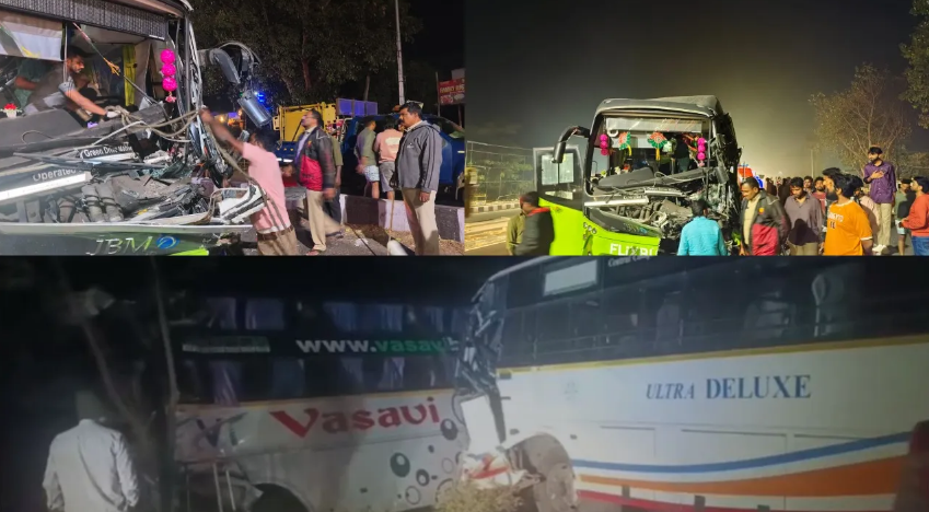 Two major road accidents were reported from different parts of Andhra Pradesh on Saturday, resulting in the deaths of two persons and injuries to several others. In Prakasam district, a private travels bus rammed into a mini lorry parked on the roadside near Chinnarikatla in Konakanamitla mandal during the early hours. At the same time, another private bus collided head-on with an APSRTC bus traveling from Vijayawada to Kanigiri, leading to the death of one person on the spot and serious injuries to 12 passengers.